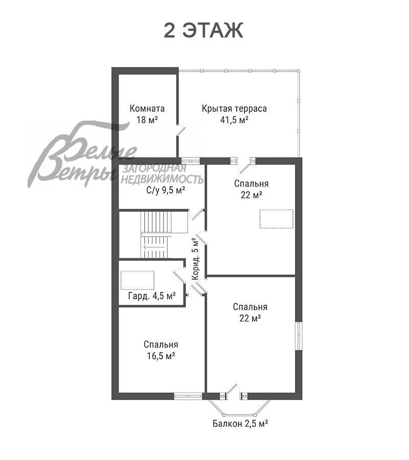 2-ой этаж: коридор 5 кв.м, спальня 22 кв.м с выходом на крытую террасу 41,5 кв.м и с выходом в пристройку, спальня 22 кв.м с выходом на балкон 2,5 кв.м, спальня 16,5 кв.м, гардеробная 4,5 кв.м, санузел с ванной 9,5 кв.м;