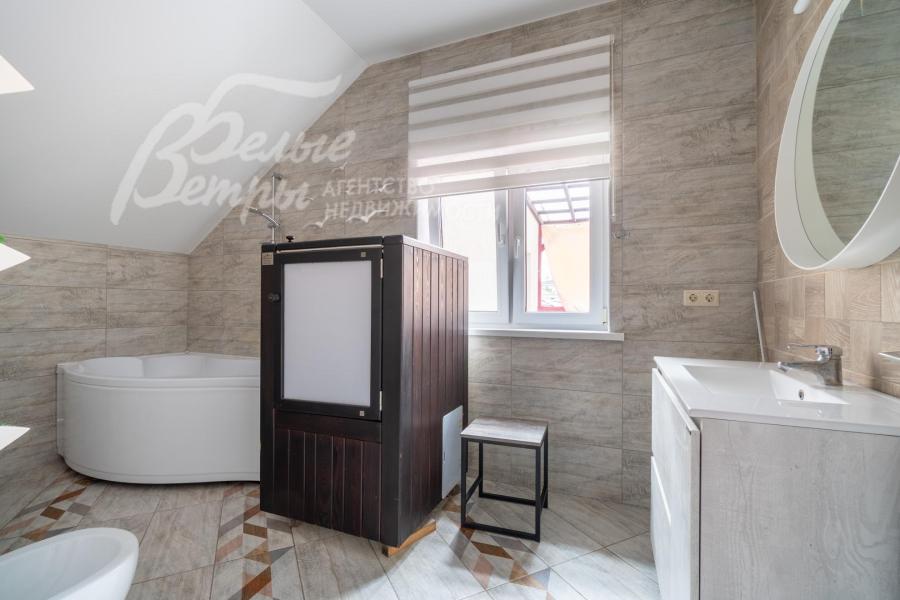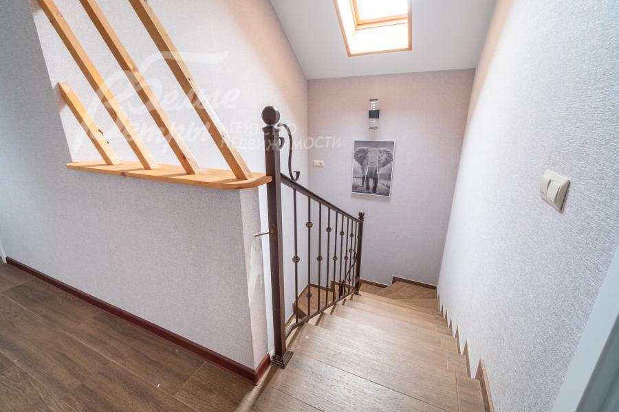 Описание внутренней отделки: в доме выполнена современная отделка уровня бизнес-класса. Стены на первом этаже окрашены краской Tikkurila Eurocolor, на втором этаже поклеены обои. Пол полностью выложен керамогранитом с интегрированной системой тёплого пола с водяным подогревом. Стены санузлов и части других помещений облицованы плиткой до потолка. Потолки натяжные, с системой встроенных светильников. В гостиной — панорамное остекление от пола. Входная группа — с дорогостоящей дверью с элементами стекла и художественной ковки. Межкомнатные двери — ProfilDoors из массива дерева, шпонированные и окрашенные в белый цвет. Высокие плинтусы выполнены в тон дверям, подоконники ламинированы в цвет оконных рам. Лестница на второй этаж — монолитная с отделкой ступеней керамогранитом, перила выполнены из художественной ковки